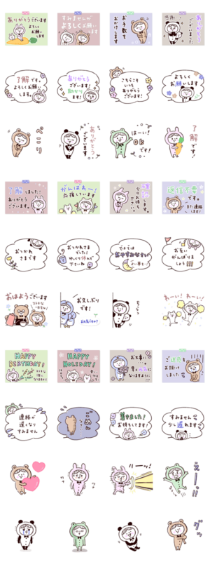 動物の着ぐるみをまとった、やさしいマトリョーシリーズの長文スタンプのセットです。敬語でていねいなやり取りに。