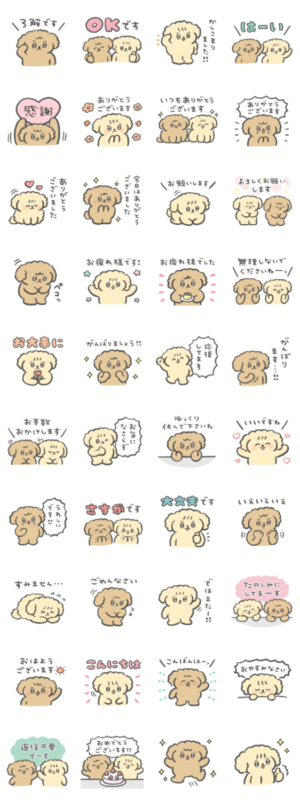 ゆるいトイプードルの使いやすいスタンプです。ちょうどいい敬語。ゆるかわ/といぷーどる/犬スタンプ/毎日使える/気づかいスタンプ/あいさつ/oroninet
