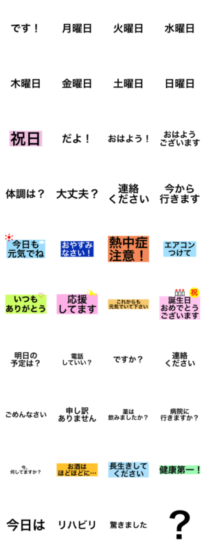 介護士福祉施設高齢者老眼見やすい文字大きい曜日あいさつ文章手紙リハビリ誕生日ですだよ応援熱中症注意健康シンプルわかりやすい簡単孫使いやすいスタンプにこにこにっこ より発売