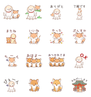 キツネフレンズのスタンプです。はじまりの2匹、ラブラドールのラムとホンドギツネのコンちゃん。その愉快な家族たちです。Inari より発売