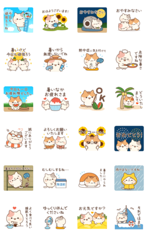 毎日の挨拶や夏に便利な気づかい言葉がたくさん!かわいいねこの暑い時期に使える飛び出るスタンプです♪