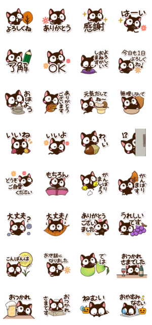 『小さい黒猫』の秋らしい雰囲気の、くろねこスタンプ。便利なクロネコスタンプ。【かたこ】かわいい・楽しい・お仕事・学校・家族・まるい・楽しい・紅葉・きのこ・ぶどうかたこ より発売