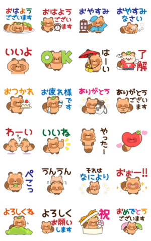 文字が大きくて読みやすい、やさしそうな化けタヌキの飛び出すスタンプです♪日常使いに便利な言葉がたくさん入っています。