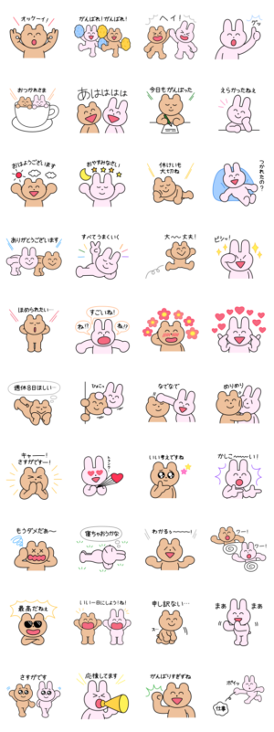 ニコニコしているうさぎとくまが応援してくれるスタンプです。毎日使えるあいさつも入っています。