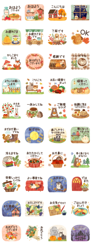 甘さ控えめ大人女子向け水彩キャラなし♪年中毎日使える♪丁寧気づかい言葉、敬語でお仕事・新生活。ママ友、 家族、カップル、挨拶、ハロウィン、森の動物、ネコ、ウサギmush より発売