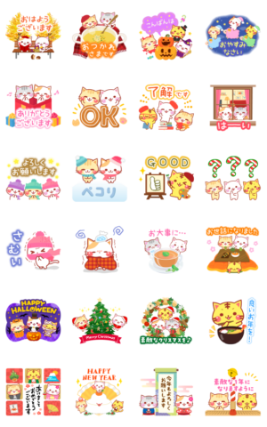 秋冬に使えるにゃーにゃー団の飛び出すスタンプ第5弾!ハロウィン、クリスマス、お正月にも使えるよ♪