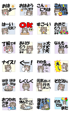 きじトラ猫の飛び出すスタンプです。挨拶や返事など毎日便利に使えます。文字は見やすいデカ文字です。