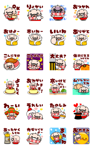 可愛いおやじ君の飛び出す冬の挨拶スタンプ。毎日の会話で使える挨拶と返事が揃ってます!家族や友達と一緒に楽しんでねー。