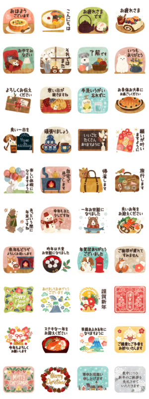 年末年始の挨拶♪冬の毎日ずっと使える丁寧気づかい言葉、敬語・お仕事。甘さ控えめ大人女子向け水彩キャラなし♪ママ友.家族.カップル.クリスマス.クマ.犬.ネコ.喪中mush より発売
