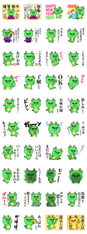 2024年は辰年。目ヂカラ☆ドラゴン(龍)が登場!お正月・新年のあいさつに使えるスタンプです。日常でも使えるスタンプも多数入っています。目ヂカラ☆にゃんこシリーズ(あけおめスタンプ2024対象)