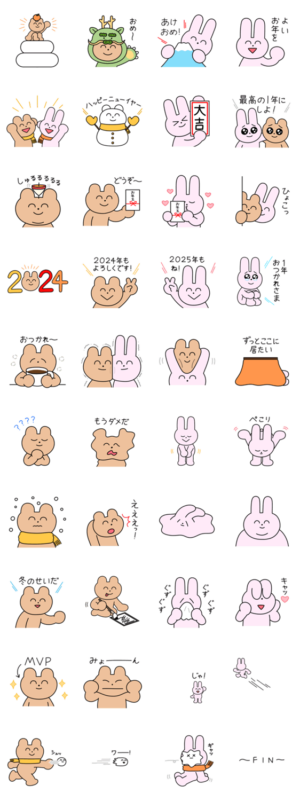年末年始につかえるうさぎとくまのスタンプです。みなさんの2024年がよい1年になりますように。(あけおめスタンプ2024対象)