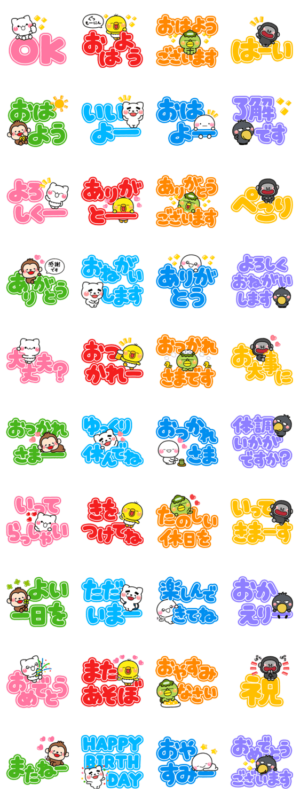 みんな大集合のデカ文字スタンプです。文字が大きいので選びやすく見やすいスタンプで、毎日使える内容を厳選し作成しました。【作:いしいともこ】