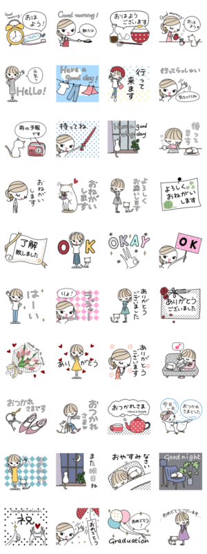 みんなの姉御!大人の毎日スタイル。よく使う挨拶にイラストに変化をつけた、毎日使える、あると便利なスタンプです。ミガクカナ より発売