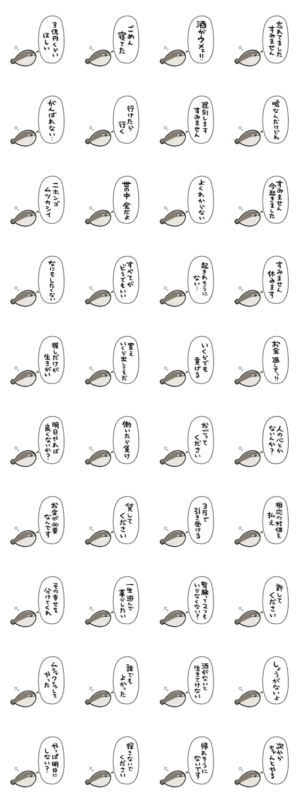 下衆なことを言うサカバンパスピスのスタンプです。ケンカ煽り用や社会不適合者の方、クズ、酒カス、怠惰、貧乏、金欠用にどうぞ。一応敬語もあるので謝罪にもどうぞ。オカヤマ より発売