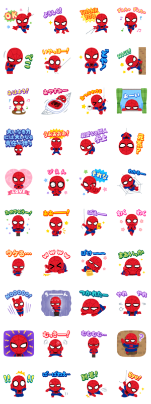 かっこいいスパイダーマンが、かわいいスタンプになりました。40個もスタンプがあり、場面によって使い分けることができます。