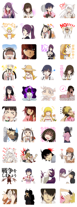 西尾維新原作の大人気アニメ「化物語」がスタンプになって登場! 主人公・阿良々木暦はもちろん、個性豊かなヒロインたちをメインに人気のキャラクターが勢揃い。講談社 より発売