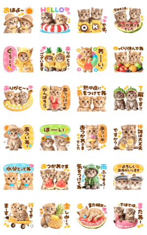 夏にかわいい♡ねこちゃんが画面いっぱいに飛び出して動くポップアップスタンプです。挨拶から気遣いの言葉まで色々揃った便利なセット!猫ちゃんが夏を可愛く彩ります♪