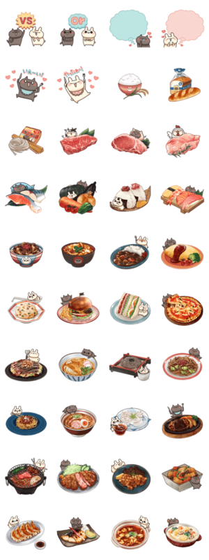 うさぎのしろとねこのくろのスタンプ第二十六弾です。今日何を食べようか迷った時や、食べたいものを伝えたい時にとっても便利!くろ より発売