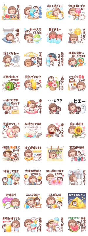 夏によく使う言葉と日常スタンプ/海/お盆休み/旅行/実家/親戚/集まり/おでかけ/約束/連絡/残暑お見舞い/あざらし/ペンギン/家族/友達/ママ友/大人女子/日常会話/敬語/挨拶
