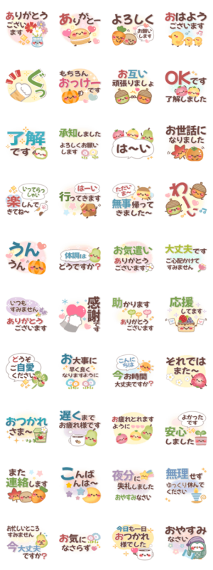 気遣いの言葉盛りだくさん!一回で伝わる便利なスタンプです。敬語/秋/思いやり/挨拶/デカ文字/日常/吹き出し/・食べ物