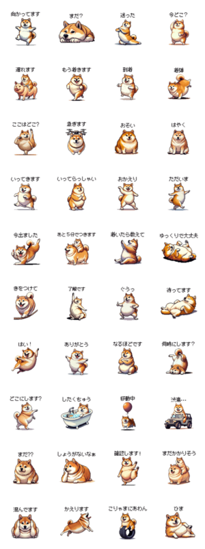 待ち合わせ/今どこ/なにしてる/予定/遅れる/挨拶/犬/料理/いただきます/グルメ/ラーメン/シバイヌ/可愛い/日常会話/返信/太っちょ/動物/可愛い/ありがとう/デブ/柴犬