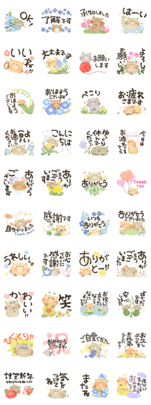 手書き筆文字とふんわり水彩画風のネコで絵手紙風のスタンプ♡家族友だち職場グループシニアデカ文字敬語丁寧語挨拶連絡毎日使いやすい日常年賀状ねこキジトラ草花多肉植物