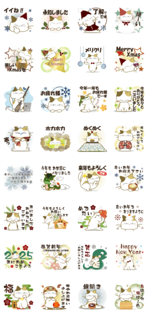 みけさんのクリスマスから年末年始に特化した「あけおめスタンプ2025」期間限定スタンプになります♥まちゃの部屋 より発売
