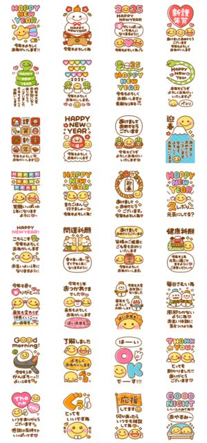 あけおめスタンプ♪巳年♡へびもたくさん登場♡2025年を可愛く彩る♪年末年始・お正月のご挨拶から日常で使えるメッセージまで♡長文で気持ち伝わるスタンプです。 ※このスタンプはトークルームで大きく表示されるBIGスタンプです。ぴよたぬき♡ より発売