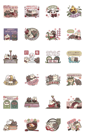 うさぎのしろとねこのくろの,動くスタンプお正月バージョンです。2025年は巳年!大人な雰囲気のくすみカラーと可愛いしろくろで幸せ招いちゃいます!