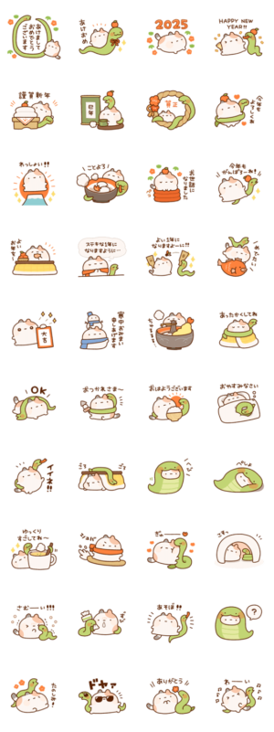 わがままボディな可愛い『ずんどうネコ』のスタンプ!巳年のお正月や年末年始の挨拶に使える便利な言葉がたくさん♫とっと より発売