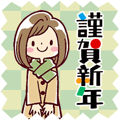 ボブヘアの娘、水彩タッチの[飛び出す]年末年始スタンプ。お友達から目上の人にも送れるスタンプです。