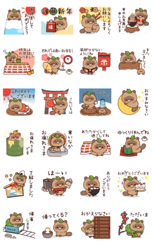 お話しするのが楽しくなるタヌキくんの年賀スタンプです♪年末年始の挨拶や日常づかいできる言葉もたくさん♪