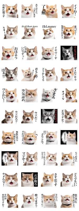 感情がつい顔に出てしまう猫のスタンプです。 ねこ/ネコ/かわいい/日常会話/感情表現/毒舌/煽り/驚きセイコウ より発売