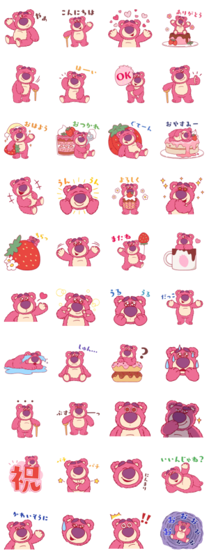 『トイ・ストーリー』シリーズのロッツォがイチゴスイーツとの組み合わせで登場!毎日使えるスタンプがいっぱいです♪家族や友達とのトークを盛り上げよう!