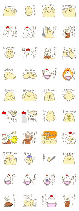 日田弁を話すひよこ、にわとり母さん、うさぎの先生のスタンプです。えりい より発売