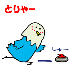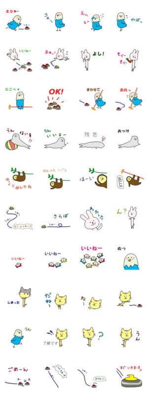 ブームになりそうなカーリングをスタンプにしてみました。セキセイインコ、うさぎ、ねこ、ナマケモノ、アザラシ達もカーリングが大好き。ストーン投げたよー。からからみさか より発売