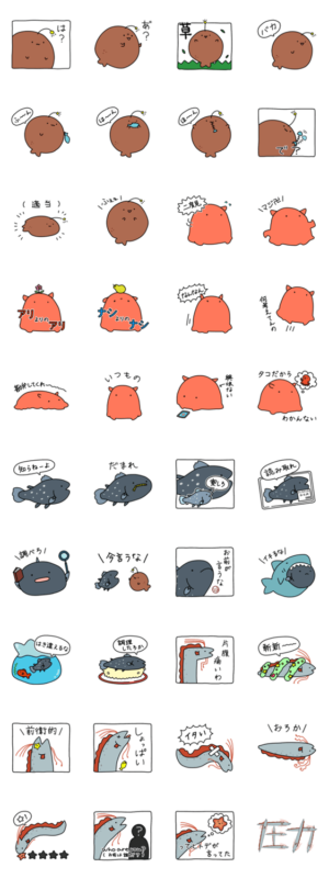 厳しい深海の環境を生きるチョウチンアンコウ、メンダコ、シーラカンス、リュウグウノツカイのスタンプです。日常会話の他、煽りや絡まれた時なんかにもどうぞ。海老白米 より発売