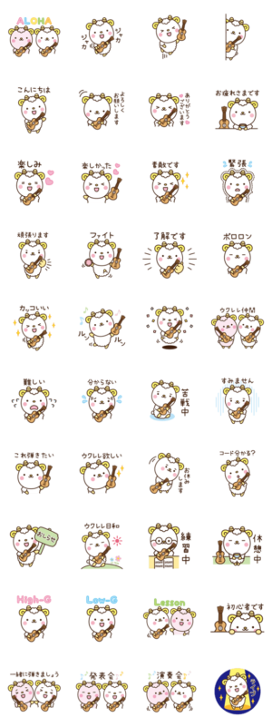 ジャコブヒツジをモチーフにした丸くてふわっと可愛い羊「メリさん」がウクレレを演奏しているスタンプです。ハワイ、フラダンス、音楽、楽器好きな方にピッタリです♡