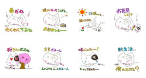 このスタンプに登場する2匹のネコは私が夜、夢でみたネコをモチーフにしたかわいいネコです。春の陽気な日、お花見、エイプリルフールなどにお使いくださいね。