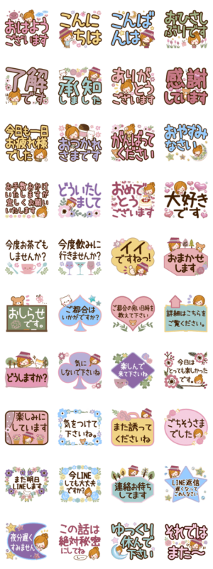 目に優しい大きな文字のスタンプです♪ 大人の方がよく使う、便利な言葉を集めました。若い方からシニアの方まで幅広くお使い頂けます❤︎「ほのぼのカノジョ」シリーズ