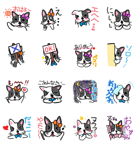 橙色のリボン⇒ボストンテリアのみかんちゃん。青色蝶ネクタイ⇒ボストンとフレンチのMIX、ダンボくん。紫色のリボン⇒フレンチブルドッグのぼたんちゃん。Luce Infinita より発売