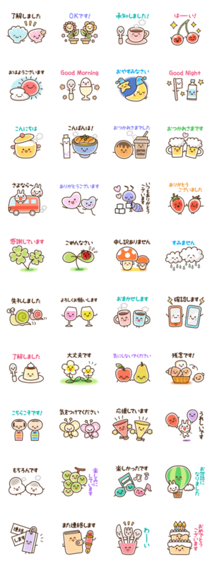 誰にでも使いやすい日常の敬語を基本セットにしました。食べ物やお菓子、植物や昆虫、キッチングッズなどをモチーフにした飽きずに長く使えるスタンプです。