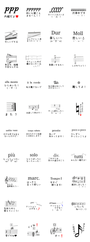 音楽記号達や実際の譜面を使ったスタンプの第2弾です。noraneko より発売
