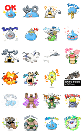 お馴染みのドラゴンクエストのかわいいモンスターのスタンプです。汎用性の高いものと使いにくいものがあります。OKやThank youは汎用性が高いのですが、ガンガンいこうぜやいのちだいじは、ドラクエの世界のように戦闘が無いため使いづらいです。