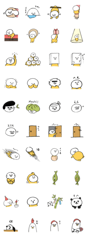 もちの妖精・まるっともっちりもちぼんのスタンプ第4弾です。やわらかめやかためのものから、大福や団子‥もちの域を超えたもちぼんスタンプです。acnooon より発売