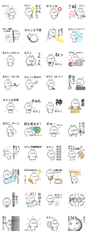「なちこ」が使う無難なゆるい名前スタンプです。なちちゃん/なちゅ/那智子/奈智子/奈知子/南智子/那知子/菜知子/菜智子/ナチコ/かわいい/面白い/シュール/うさぎ/等/専用アルクルム より発売