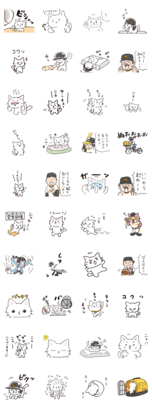 読売新聞日曜版人気連載マンガ「猫ピッチャー」の公式スタンプ第1弾。プロ野球界初の猫投手・ミー太郎が、猫ならではの好プレー珍プレーでライバルを打ち取ります!