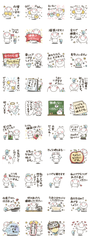 まるぴシリーズの17弾です。白くて丸いスマイルくん。受験生、部活、大会、試験、仕事、育児、スポーツ、頑張っている人に励ましの言葉や応援する気持ちを伝えるスタンプ。