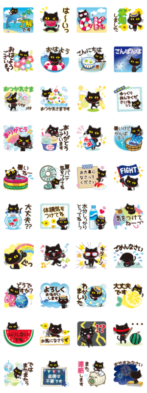 黒猫の涼しげな夏スタンプです〜♪これからの季節に使える気づかい言葉もたくさん♥家族や友達、大切な人に送って暑い夏をのりきりましょーッ!紅おれんじ より発売