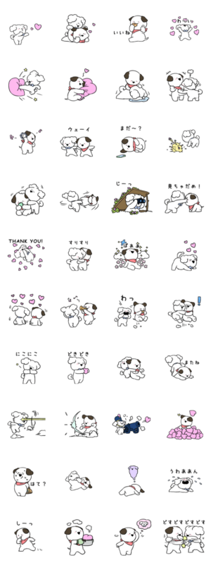 ハイテンションでケンカするほど仲がいい!?「すこぶる動くウサギ」フレンズ。いつでもラブラブなカップルわんこの、かわいいチビver.ボリューム満点静止画スタンプです!株式会社DK より発売